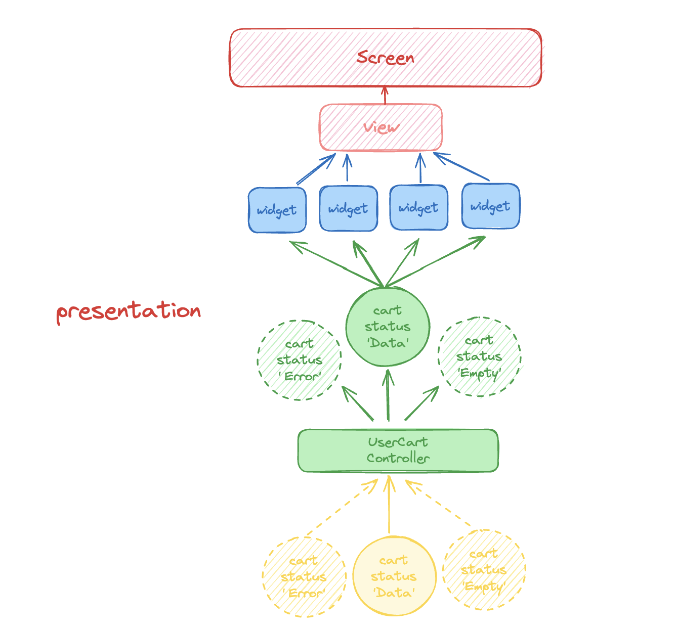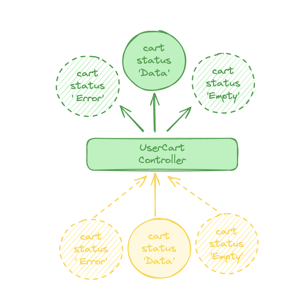 class UserCartScreen extends ConsumerStatefulWidget { static String get routeName => 'user_cart'; const UserCartScreen({ super.key, }); @override ConsumerState<UserCartScreen> createState() => _UserCartScreenState(); } class _UserCartScreenState extends ConsumerState<UserCartScreen> { @override void initState() { ref.read(userCartControllerProvider.notifier).getUserCart(); super.initState(); } @override Widget build(BuildContext context) { final state = ref.watch(userCartControllerProvider); return DefaultLayout( // 바텀시트 생략 child: CustomScrollView( slivers: [ //📌 [ Loading ] if (state is CartLoading) CartLoadingView(), // 📌 [ Error ] if (state is CartError) CartErrorView(), //📌 [ Empty ] if (state is CartEmpty) CartEmptyView(), //📌 [ Data ] if (state is CartData) CartDataView(), ], )); } }widget은 컨트롤러의 상태를 Observes 하고 있기 때문에 언제든지 해당 상태, 데이터에 맞게 유저에게 보여줄 준비가 되어있습니다.