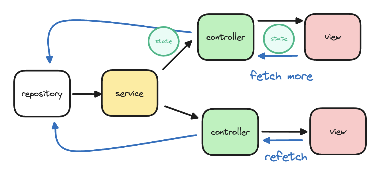 class PaginationController<T extends IModelWithId, U extends IBasePaginationService<T>> extends StateNotifier<PaginationBase> { final U service; final PaginationType type; PaginationController({ required this.service, required this.type, }) : super(PaginationLoading()) { paginate(); } Future<void> paginate({ int fetchCount = 20, // 추가 데이터 가져오기 true: ++데이터, false: 새로고침(현재상태를 덮어씌움) bool fetchMore = false, // 강제 리로딩 bool forceRefetch = false, String firstCursor = '0000000000000000', }) async { // 페이지네이션 Data가 있고 새로고침을 한 것도 아닌 상태에서 받아올 데이터가 없을때 if (state is Pagination && !forceRefetch) { final pState = state as Pagination; if (!pState.meta.hasNextData) { return; } } final isLoading = state is PaginationLoading; final isRefetching = state is PaginationRefetching; final isFetchingMore = state is PaginationFetchingMore; // 데이터를 가져오는 상황에서 다른 요청이 들어온다면 추가처리를 하지않고 함수를 종료한다 if (fetchMore && (isLoading || isRefetching || isFetchingMore)) { return; } // 커서 재정비 if (type == PaginationType.storeDist || type == PaginationType.point || type == PaginationType.notice || type == PaginationType.myReview) { firstCursor = '0000000000000000'; } else { firstCursor = '9999999999999999'; } PaginationParams? paginationParams = PaginationParams( take: fetchCount, customCursor: firstCursor, ); // 데이터를 더 가져오는 상황 if (fetchMore) { final pState = state as Pagination<T>; state = PaginationFetchingMore( meta: pState.meta, data: pState.data, ); paginationParams = paginationParams.copyWith( customCursor: pState.meta.customCursor, ); } else { if (state is Pagination && !forceRefetch) { final pState = state as Pagination<T>; state = PaginationRefetching<T>( data: pState.data, meta: pState.meta, ); } else { state = PaginationLoading(); } } // 실제 네트워크 통신이 일어나는 부분 final result = await service.paginate(type: type, paginationParams: paginationParams); final value = switch (result) { Success(value: final value) => value, Failure(exception: final e) => e, }; //[ERROR] 에러가 발생했을 시, 페이지네이션 타입에따라 에러를 처리하는 과정 if (value is CustomExceptions) { value.maybeWhen( orElse: () { state = PaginationError(mapper: ErrorMapper()); }, // 페이지네이션 종류에따라 같은 에러도 다른 에러화면으로 나타내도록 함 notingStore: (message) { state = PaginationNothing( mapper: ErrorMapper( errorIllust: ImagePathIllust.illust09, message: '현재위치에서 영업중인 매장이 없어요', )); if (type == PaginationType.favorite) { state = PaginationNothing( mapper: ErrorMapper( errorIllust: ImagePathIllust.illust12, message: '아직 관심매장이 없어요', )); } }, ); } //[Data] 연속된 데이터를 보여주기위해 기존 데이터에 받은 데이터를 이어붙여줌 if (state is PaginationFetchingMore) { final pState = state as PaginationFetchingMore<T>; if (value is Pagination<T>) { state = value.copyWith(data: [ ...pState.data, ...value.data, ]); } } else { // 첫 페이지네이션 요청 if (value is Pagination<T>) { // 빈 배열에 대한 에러 화면을 구성하는 부분 if (value.data.isEmpty) { if (type == PaginationType.history) { state = PaginationNothing( mapper: ErrorMapper( errorIllust: ImagePathIllust.history_empty_illust, message: '아직 주문내역이 없어요')); } if (type == PaginationType.myReview) { state = PaginationNothing( mapper: ErrorMapper( errorIllust: ImagePathIllust.review_empty_illust, message: '작성한 리뷰가 없어요')); } return; } state = value; } } } }무한 스크롤UI에 들어가는 데이터를 구성하는 부분입니다. 주석으로 설명이 부족한 부분들만 추가로 정리 해 보도록 하겠습니다.