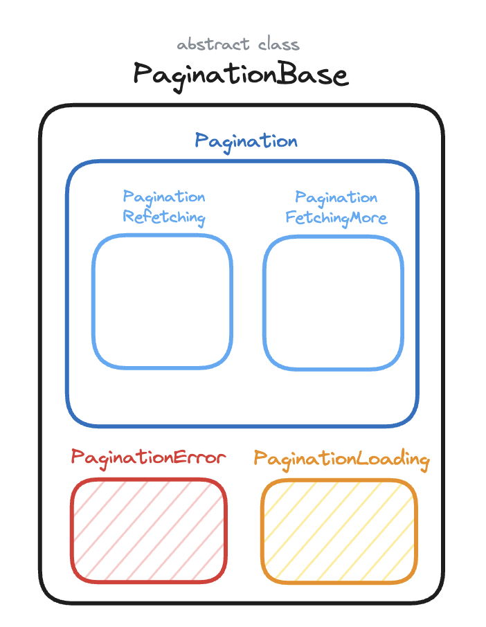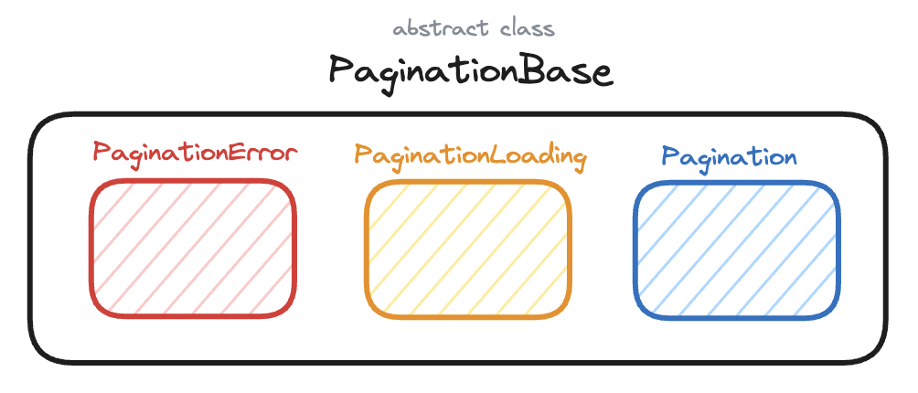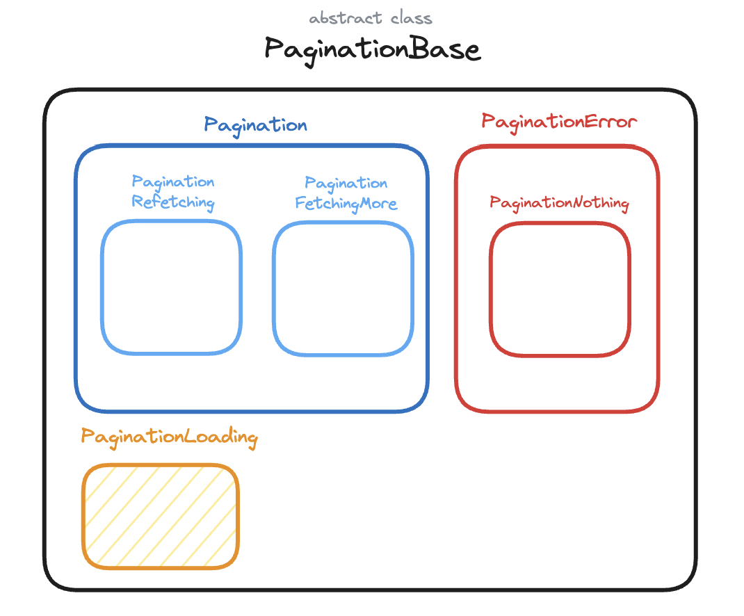 Pagination은 다양한 종류의 페이징 상태가 나타나게 됩니다. 상태는 class로 구성하기때문에 가장먼저 해야할 일은 모든 클래스를 그룹화 해 줄 추상클래스를 정의하고 기본적인 네트워크 상태(Error, Loading, Data)에 대해 정의하는 일입니다.
