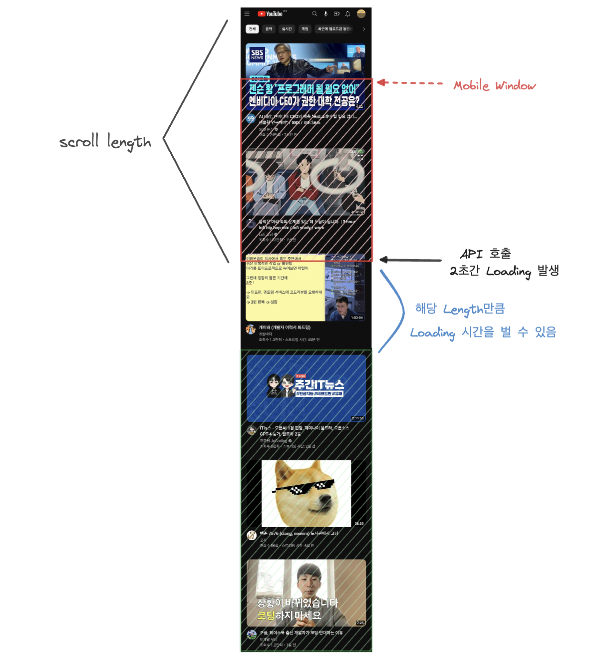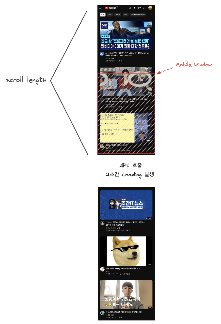 예를들어 유튜브 콘텐츠를 불러올때 데이터를 3개씩 보여주고 3개의 데이터를 모두 보여줬을때 쯤에 다음 데이터를 불러온다고 가정하겠습니다. 만약 로딩시 2초가 걸린다고 한다면 유저는 다음 데이터를 불러올때까지 2초간 Loading Indicator를 보면서 기다려야 할 겁니다.