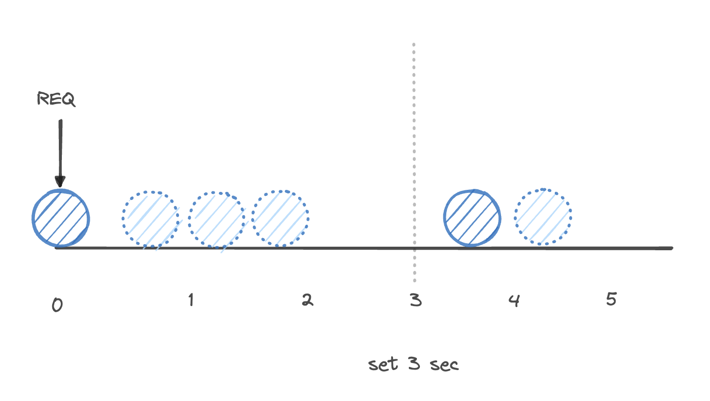 예를들어 그림과 같이 throttle을 3초로 설정한다면 첫 요청이 발생한 순간부터 3초 이내에 발생하는 동일한 api 호출의 중복된 요청은 모두 무시해서 결국 처음 요청만 실행되게 됩니다.