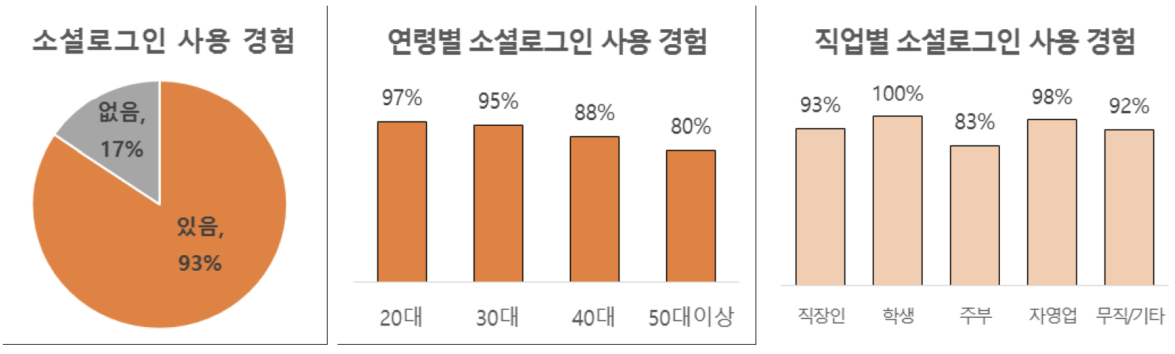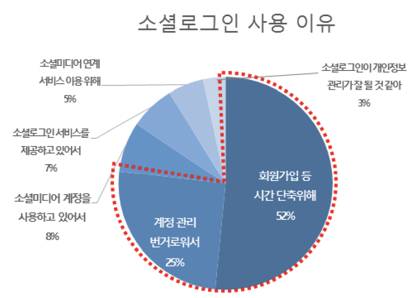 출처: 한국소비자연맹 소셜 로그인 플랫폼은 디바이스를 사용하기 위해선 꼭 있어야하는 계정이거나(ex. 애플) 많은 사람들이 사용하고 있는 대형 플랫폼인 경우가 많습니다. 이러한 이유로 대부분의 유저들은 소셜로그인을 제공하는 기업의 계정을 보통 하나 이상 가지고 있기 마련이죠. (물론 이것조차 없는 유저를 위해 자체 회원가입을 추가로 제공하는 경우도 존재합니다.)