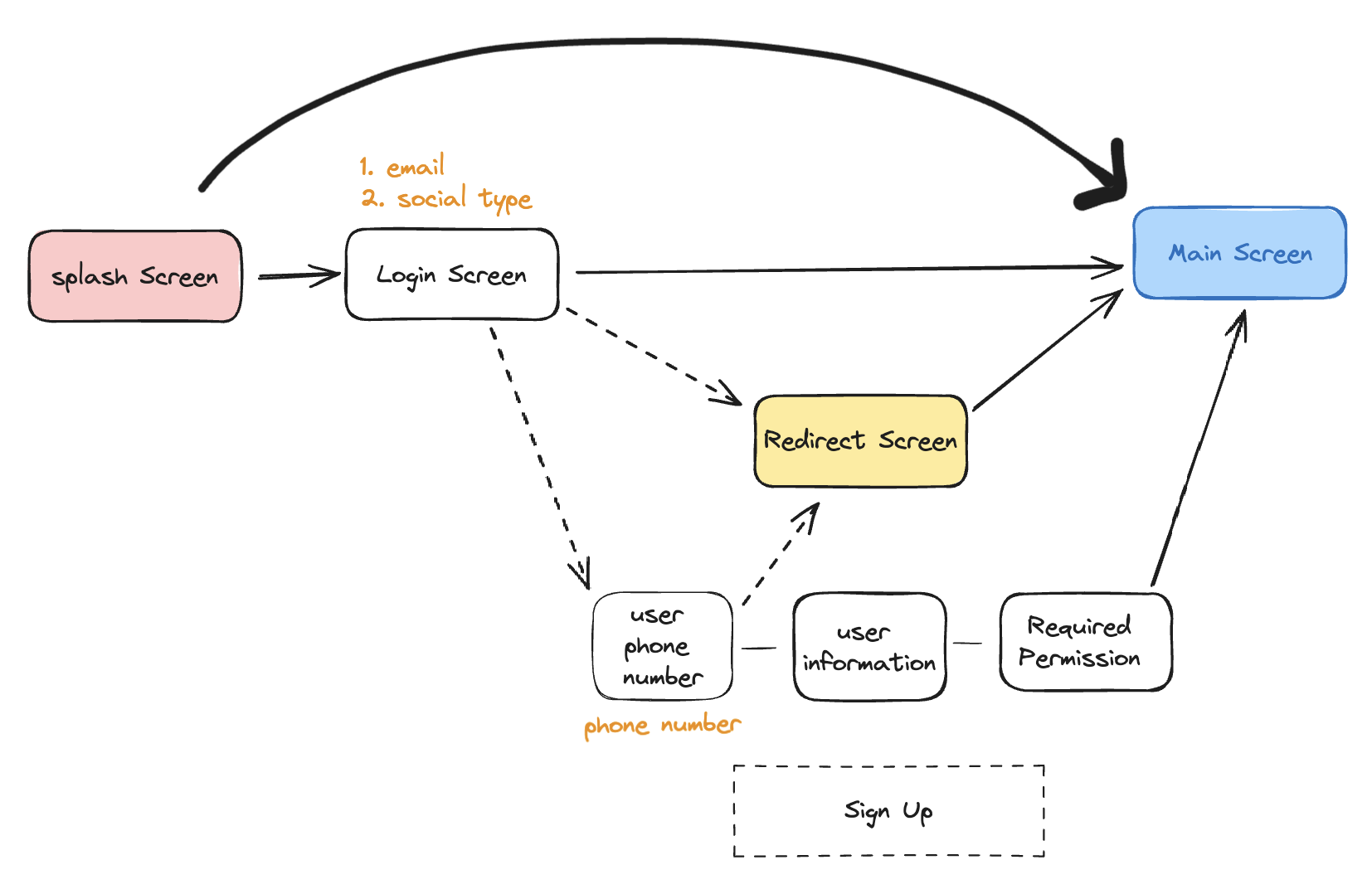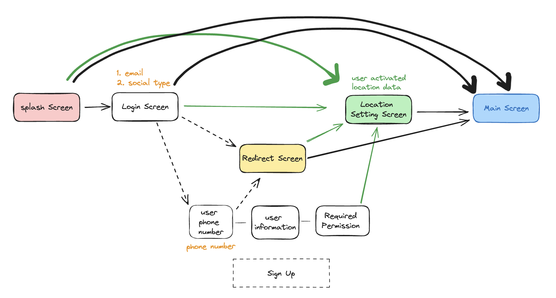 보통 메인화면에 도달하기전까진 회원가입을 수행하는 단계라고 생각할수있죠. 하지만 위치설정을 한다는 것은 단순히 로그인 화면과 메인화면사이에 있다고해서 회원가입 플로우에 둘 순 없었습니다. 이유는 다음과 같습니다.