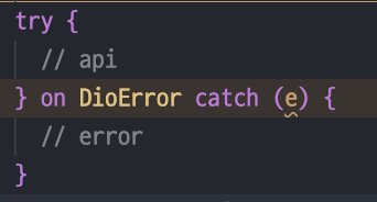 - try/catch에서 on DioError catch {}를 통해 에러 객체를 받는다.