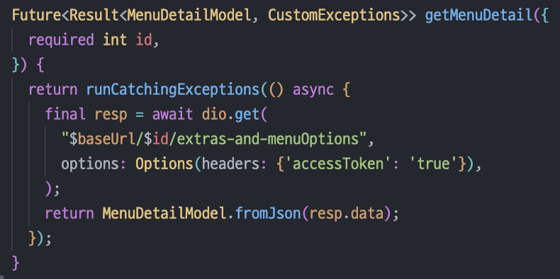 Future<T> apiCall<T>(Future<T> Function() task) async { try { T value = await task(); } on DioError catch (e){ final errorModel = ExceptionModel.fromJson(e.response!.data); switch (errorModel.errorCode) { case '0000': return const CustomExceptions.userNotFound(); case '0001': return const CustomExceptions.emailNotFound(); case '0002': return const CustomExceptions.emailExistsWithAnotherSocialType(); ... default: return Failure(CustomExceptions.dioUnknown('통신 에러입니다')); } } catch (e) { CustomExceptions.unCaughtByFront('알수없는 에러입니다: ${e.toString()}'); } }📌 Result 패턴 추가