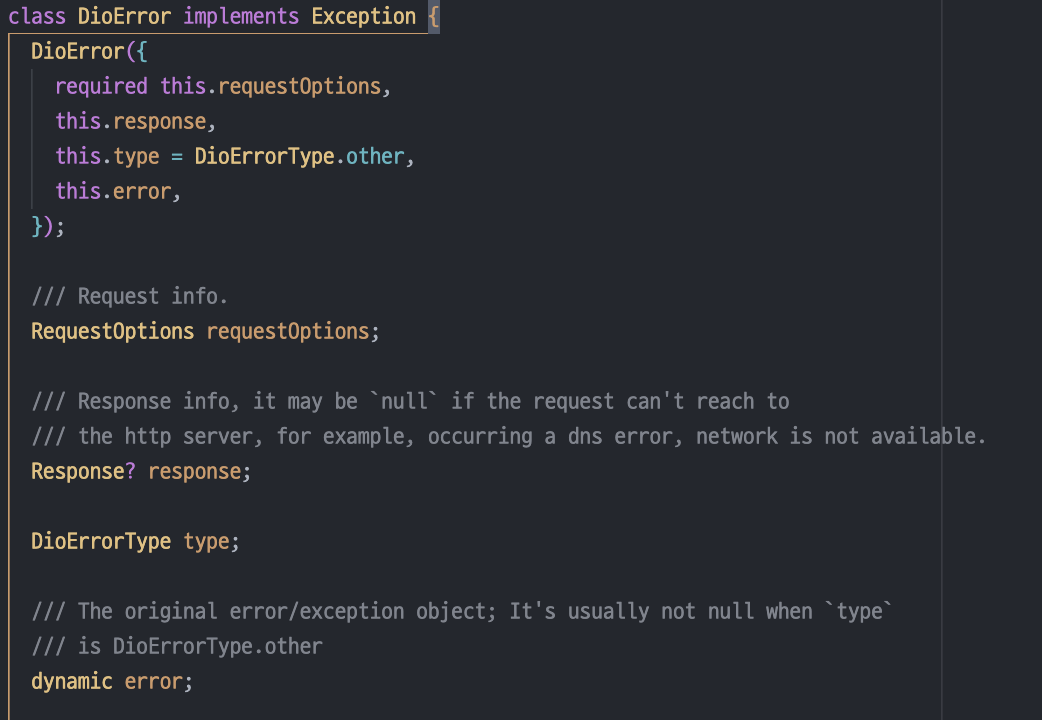 DioError를 들여다보면 통신에 성공했을 때 받는 response과 같은 객체를 return 받는 것을 알 수 있고,